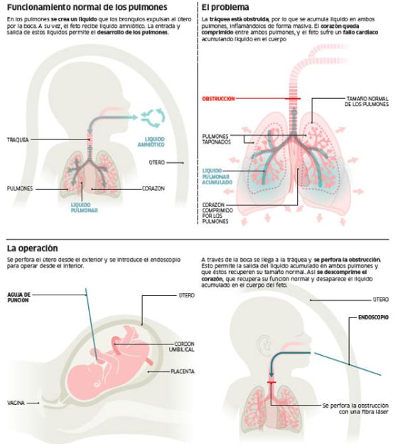 Els pares de Gonzalo, María José i Francisco, van arribar al març de l'any passat a Barcelona pensant que havien de avortar. La doctora que va tractar a Almeria havia contactat d'urgència amb els metges de Barcelona per explicar el cas d'un fetus que patia una obstrucció de laringe que li tapava els pulmons. Com a conseqüència, els pulmons estaven plens de líquid, dilatats, i comprimien el cor. Diagnòstic: parada cardíaca. "Ens van contactar com un cas perdut. En el passat, sempre havia estat així ", ha resumit Josep Maria Martínez, coordinador de Teràpia Fetal de l' Hospital Clínic.